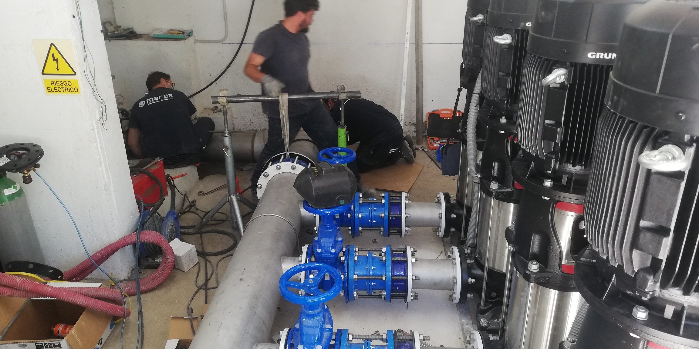 - Conexión a tubería impulsión con piezas de calderería en acero inoxidable, valvulería y accesorios.